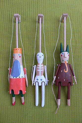 Bára Hubená je česká loutkářka a divadelní a kostýmní návrhářka. Uvedu její marionety řezané z lipového dřeva a doplněné ruční malbou a textilními detaily. Loutky jsou krásně jednoduché, nožky jsou připevněné provázkem ke špalíčkovému tělu a celá loutka je usazena na tyčce. Větší loutky mají navíc vodící provázky k rukám. Moc se mi líbí jednoduše rozverná stylizace a kombinace s textilem. Bára Hubená má tvorbu velmi širokou, vedle výroby loutek a dekorativních hraček ze dřeva pořádá i dílny pro děti.