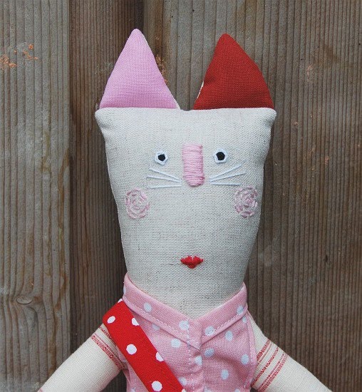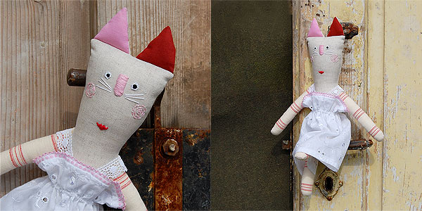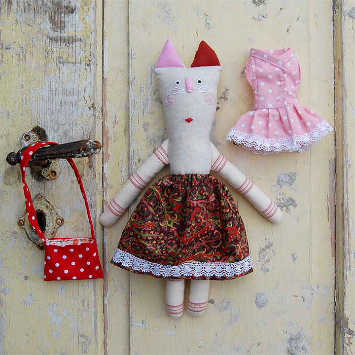 Po delší době vznikla další kočička...tentokrát se šatama, madeirovou spodničkou, pleteným kabátkem a kabelkou. Lněné plátno, bavlna, ruční výšivka, vlna.